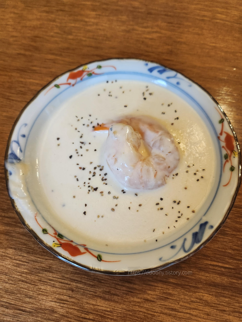 오늘은 새우가 나왔는데 소스가 샐러드소스와 비슷하면서도 다른 맛이다